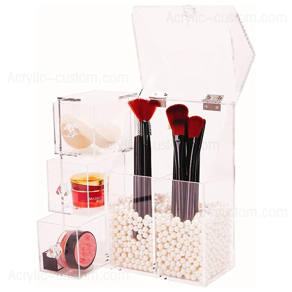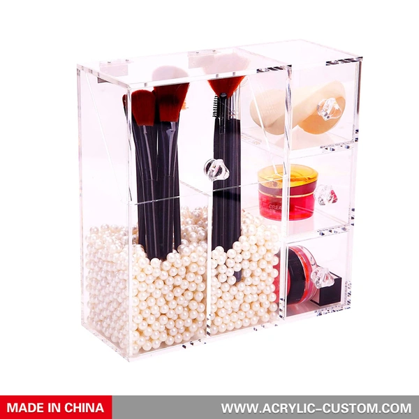1.非常に耐久性のある4mm厚の透明アクリル製。2つのメイクアップブラシホルダーと3つの引き出しをすべて1つのケースに入れてフリーベージュパールで使用した後、乳白色になりません。