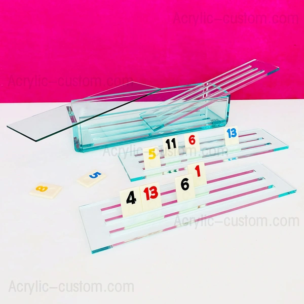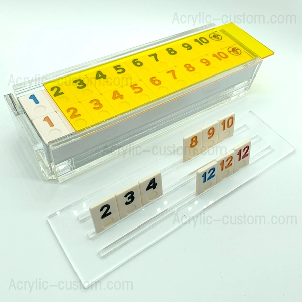 1. 美しいラミー ゲーム タイルのセットは、手で曲げたアクリル ボックスに入っています。スライド式の透明な色の蓋が付いています。