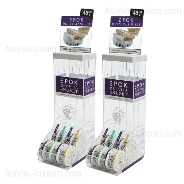 視認性、セキュリティ、顧客エンゲージメントを最大限に高めながら製品を美しく展示するように設計されたカスタム アクリル スヌース ディスプレイ ケースを使用して、ブランドを高め、売上を伸ばします。製品を機能的かつ販売重視の方法で展示することが重要です。